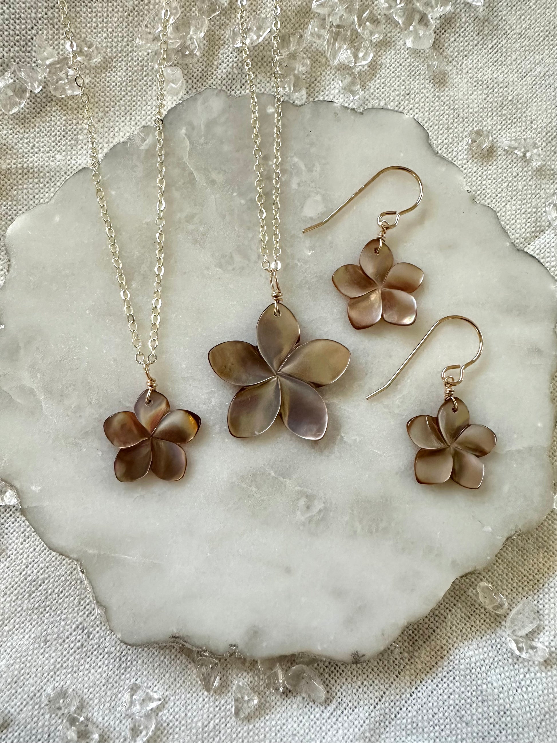 Simple designs always elevate your outfit! These high-quality mother-of-pearl plumeria pieces come in medium or small, in either classic white or warm golden brown. Each pua shines subtly, catching the light in a soft, elegant way. Wear the necklace and earrings on their own or as a beautifully coordinated matching set.