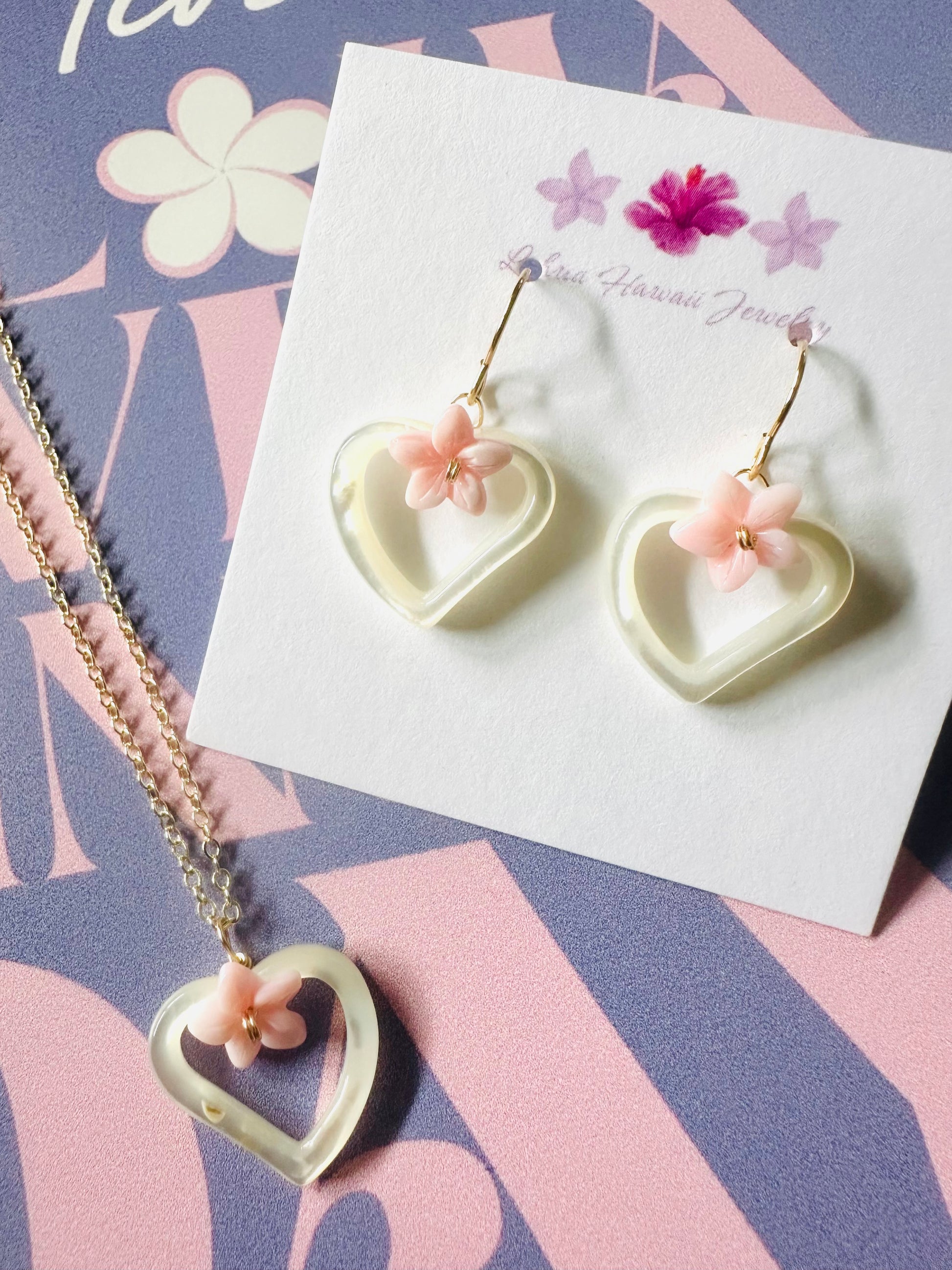 These elegant necklace feature a delicate mother-of-pearl heart paired with pink conch shell flower, effortlessly capturing island vibes. Their simple yet stunning design complements any outfit, making them a versatile addition to your collection. Matching earrings are available to complete the look with this necklace.