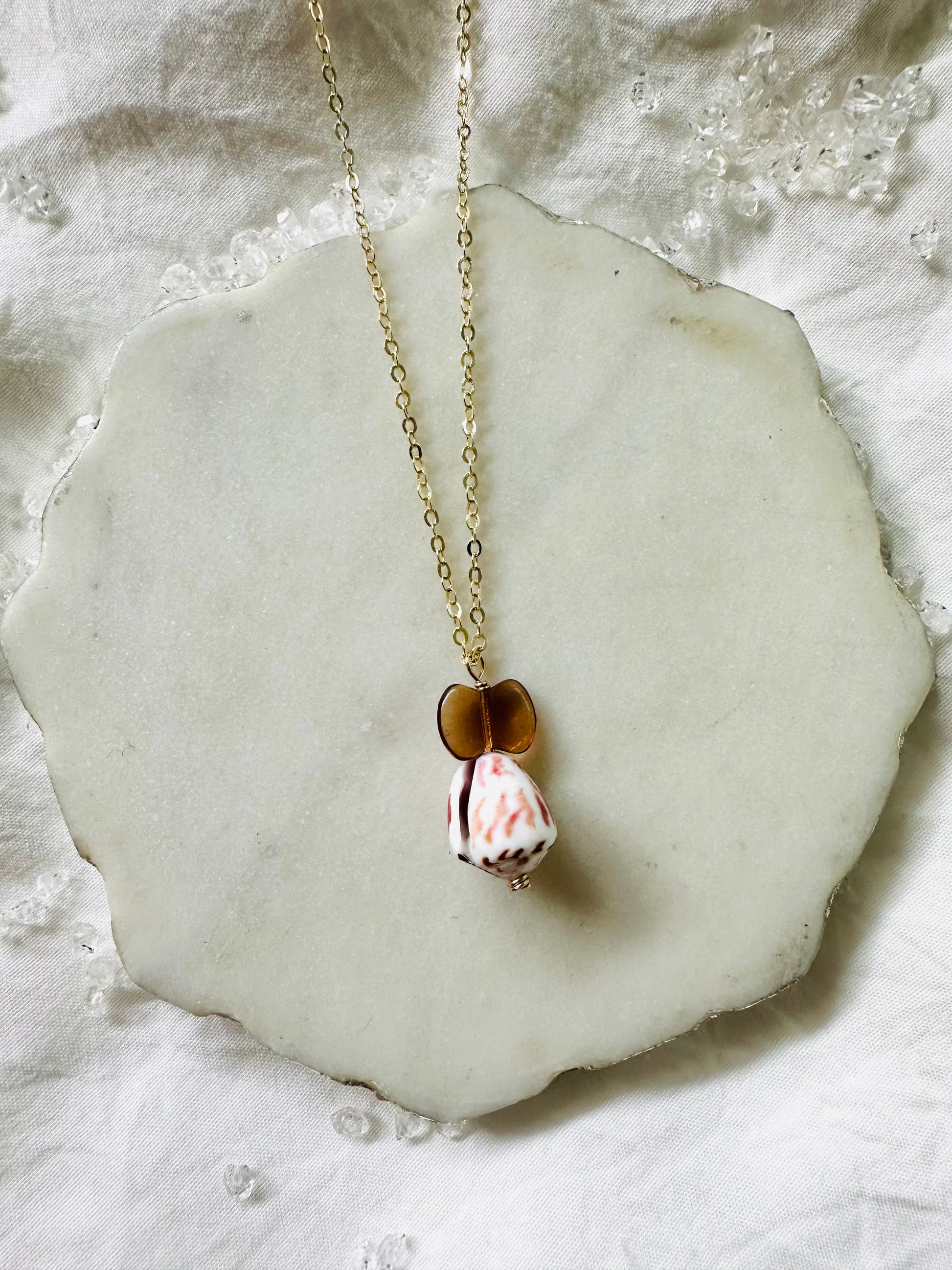 Each piece is handmade with love using 14k gold-filled elements, natural shells, pearls, gemstones, glass, and clay beads. Treat it kindly and it will last beautifully. 💛